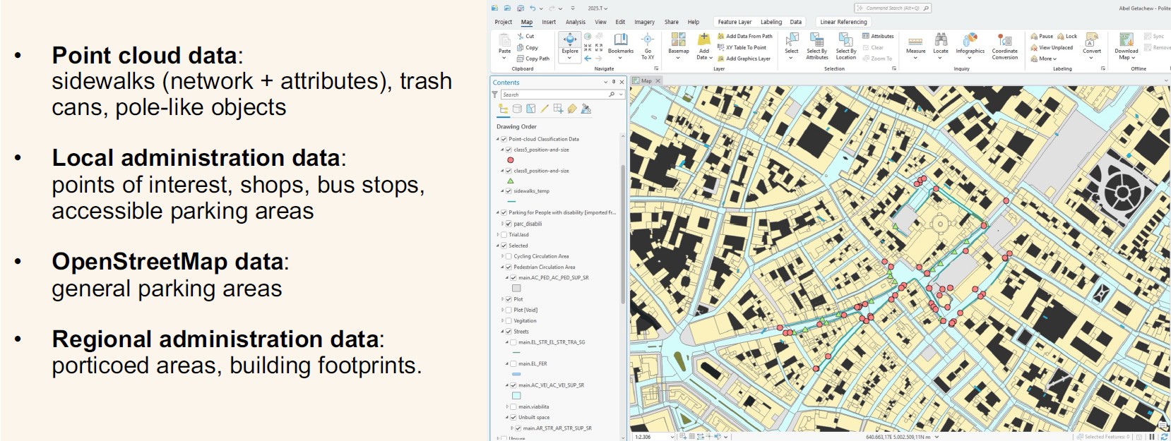 From the acquired 3D database, key accessibility parameters have been extracted and integrated with GIS layers and open data, resulting in a platform capable of multi-criteria analysis, thematic visualisations and, in the future, personalised accessible route planning.